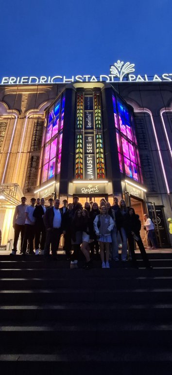 Am Dienstag besuchten wir nach dem Frühstück den sogenannten ,,Tränenpalast”. Der Tränenpalast war in der Zeit der DDR der Grenzübergang an der Friedrichstraße von Ost- nach Westberlin. Er heißt so, weil sich dort die Familien trennen mussten und während dessen viele Tränen vergossen wurden. Sie wussten nie, ob sie ihre Verwandten jemals wiedersehen werden. Nach der Führung hatten wir Freizeit. Zurück im Hotel machten wir uns schick für eine Überraschung am Abend. Wir gingen in die Grand Show ,,Blinded by Delight” in den Friedrichstadtpalast. Das Gebäude war atemberaubend schön und man konnte dort gut Fotos machen. Die Show hatte ein eigenes Orchester. Sie spielten während der Show jedes Lied live. Die Schauspieler, Tänzer und Akrobaten hatten sehr schöne Stimmen. Sehr talentierte Akrobaten und Tänzer führten eine mitreißende Show auf. Die Choreographien waren traumhaft. Man merkte, dass hinter der Show sehr viel Arbeit steckte. Dort sind einige schöne Bilder und Momente entstanden. Die Grand Show war wunderschön konzipiert und hat uns allen sehr gefallen. Die Premiere fand erst am folgenden Abend mit viel prominenten Gästen statt. In der ZDF Mediathek gibt es eine Dokumentation und eine Serie zum ‚Palast‘.