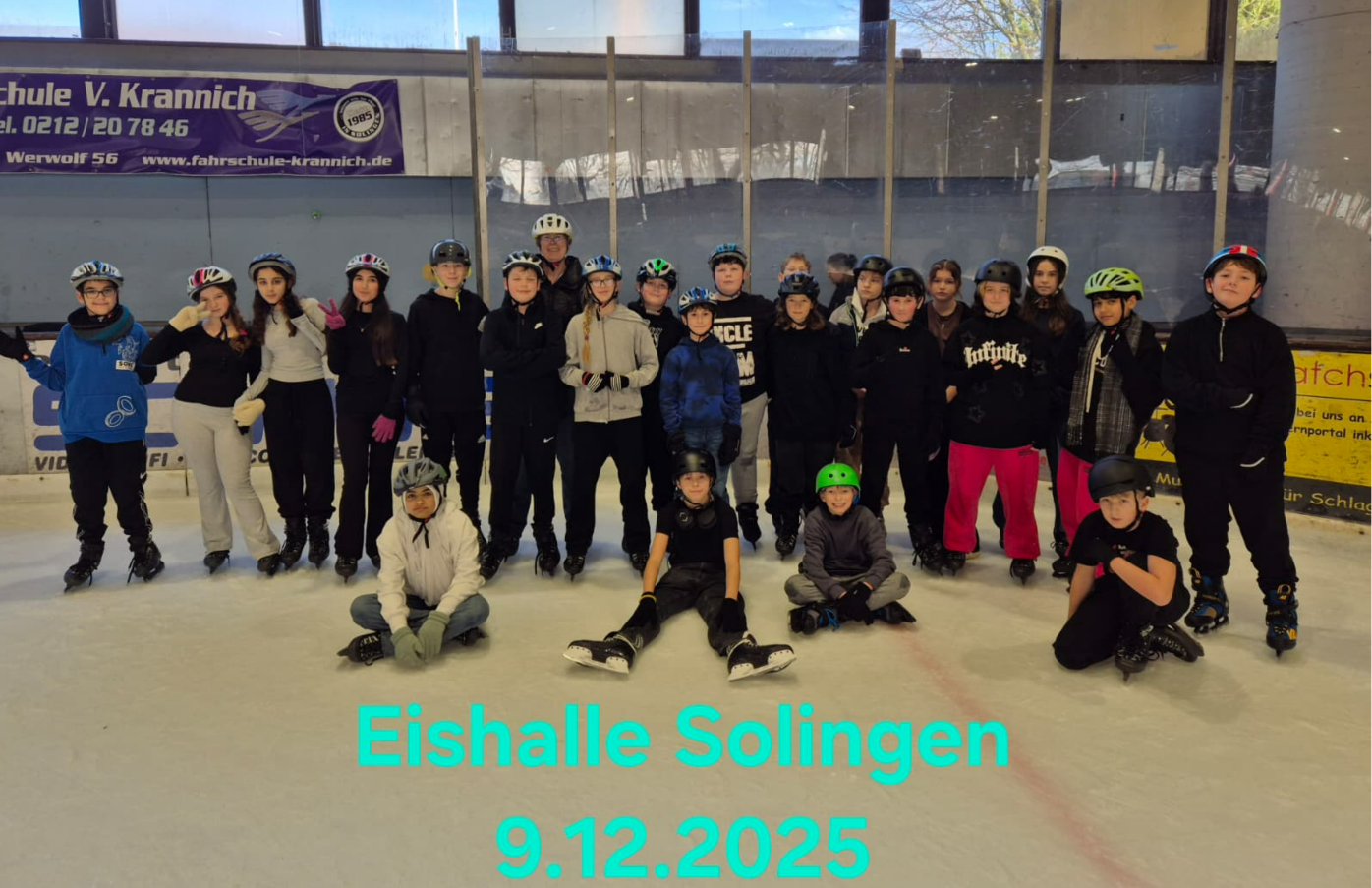 Am Dienstag, den 9.12., hieß es für die Klassen 6d, 7d und 6c: Raus aus dem Klassenzimmer und ab aufs Eis! Bereits um 7.55 Uhr trafen sich alle gut gelaunt an der Wilhelmine-Fliedner-Schule, um gemeinsam mit der S-Bahn zur Eishalle nach Solingen zu fahren. Schon die Anreise war ein kleines Abenteuer – inklusive langer Wartezeiten am Bahnhof und eines eher knalligen Zwischenfalls, bei dem einige Siebtklässler den Bahnhof kurzzeitig mit Knallerbsen beschallten.