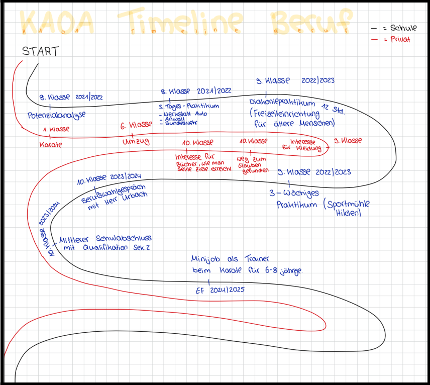 Wir haben mit einem Warm-up begonnen, wo wir Hobbys und Berufe erraten mussten. Das war sehr lustig:). Anschließend haben wir einen Fragebogen ausgefüllt, dann in einer Gruppe gemeinsam ein Plakat zu unseren Wünschen und Erwartungen an den Workshop erstellt und vorgestellt. Es ging weiter mit der Gruppenarbeit (dies fand ich sehr gut, da Gruppenarbeit immer toll ist : ) Wir haben auch darüber gesprochen, was im Workshop nicht passieren sollte. Danach haben wir in einem Partnerinterview über uns und unsere Stärken gesprochen. Dabei hatte man einen Partner, den man noch nicht so gut kannte. Fand ich ebenfalls sehr gut, da man vieles, neues über die Person kennenlernte und nicht immer mit den gleichen Leuten gearbeitet hat. Darauf folgend haben wir alle eine Timeline erstellt, wo wir alle unsere Schritte in Bezug auf bisherige Erfahrungen, beispielsweise die Potenzialanalyse in Klasse 8 oder auch das Praktikum in Klasse 9, notieren und bewerten sollten.