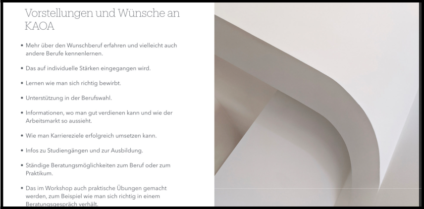 Zunächst haben wir allgemeine Informationen zur Berufs- und Studienberatung in der Sek 2 erhalten und kurz darüber gesprochen, was wir heute machen. Das fand ich sehr gut, da man einen groben Überblick darüber hatte, was heute so ansteht.