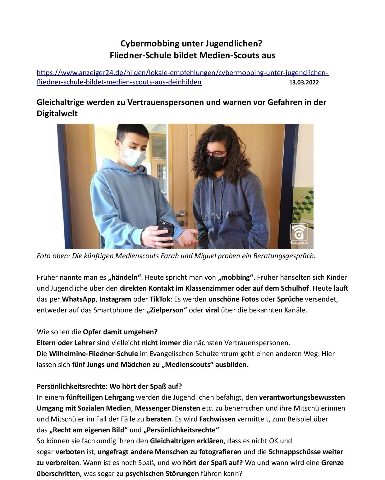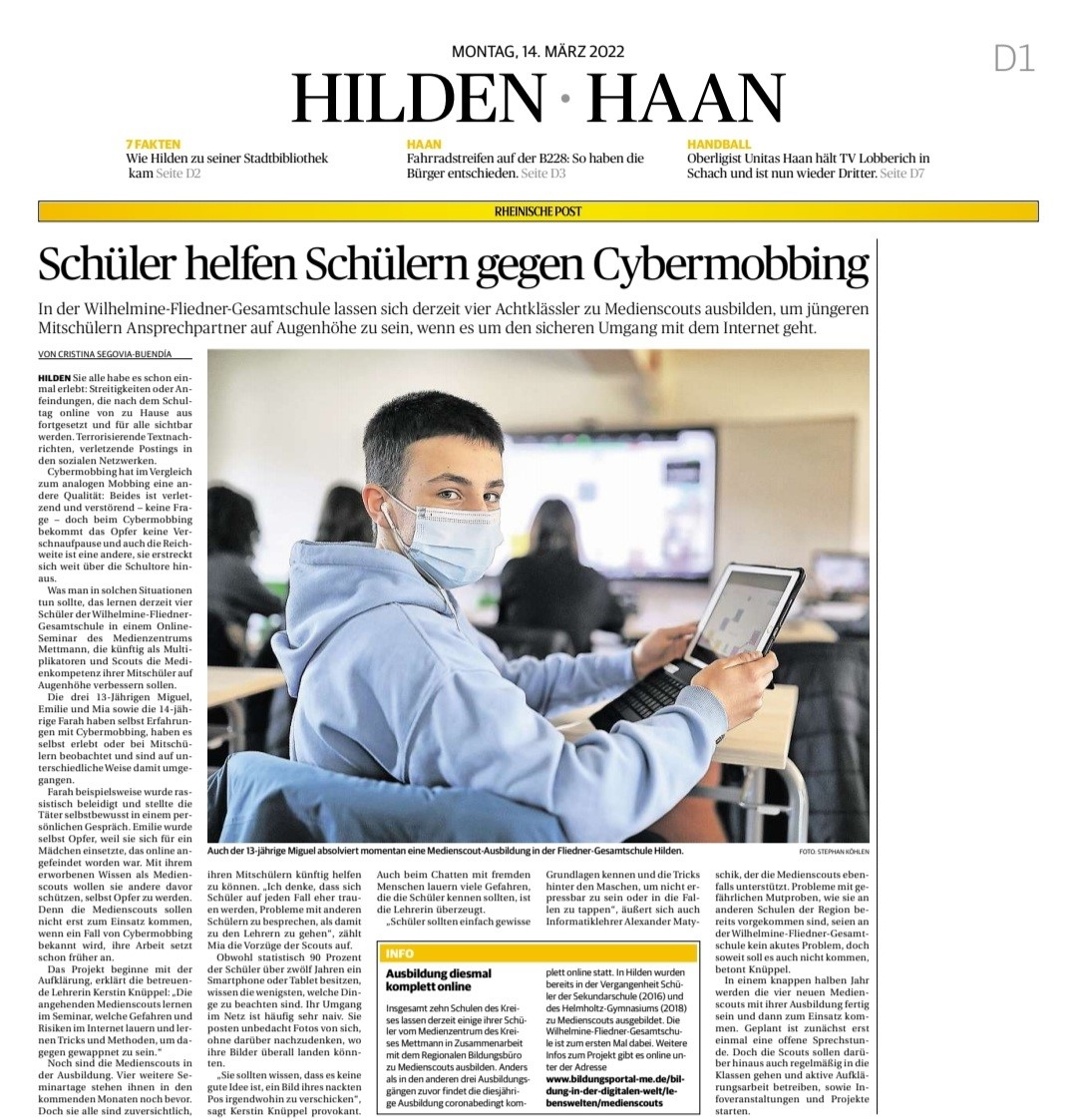 In einer zunehmend vernetzten und digitalisierten Welt, in der digitale Medien aus dem Alltag von Kindern, Jugendlichen und Erwachsenen nicht mehr wegzudenken sind, gewinnt Medienkompetenz eine immer größere Bedeutung – nicht nur im privaten Umfeld, sondern ganz besonders auch im schulischen Kontext. Genau hier setzen wir als Medienscouts an. Wir, Eda, Colin, Oliver und Jonah, sind Teil des Medienscout-Teams unserer Schule, der Wilhelmine-Fliedner-Gesamtschule (WFS). Unsere Aufgabe ist es, unseren Mitschülerinnen und Mitschülern sowie der gesamten Schulgemeinschaft beratend, unterstützend und aufklärend zur Seite zu stehen, wenn es um das Thema Internet und den verantwortungsvollen Umgang mit digitalen Medien geht. Als speziell geschulte Schülerinnen und Schüler befassen wir uns intensiv mit zentralen Problembereichen, die in der heutigen digitalen Zeit immer häufiger auftreten und oftmals zu ernstzunehmenden Konflikten und Belastungen führen.