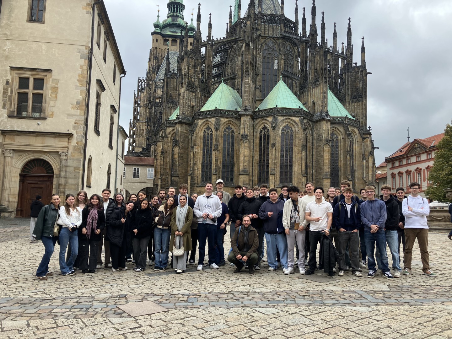 Vom 6. bis 10. Oktober 2025 begab sich die Q2 auf ihre Stufenfahrt in die tschechische Hauptstadt Prag. Los ging es frühmorgens um 5:45 Uhr an der Schule, eine Uhrzeit, über die sich natürlich alle riesig gefreut haben. Nach einer rund elfstündigen Fahrt erreichte die Gruppe gegen 17 Uhr das Hotel Prague Centre Plaza in der Prager Neustadt. Nach dem Beziehen der Zimmer blieb am Ankunftstag Zeit, sich etwas auszuruhen und die Umgebung kennenzulernen.