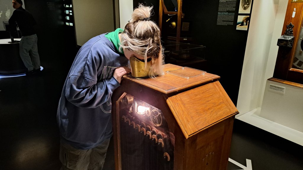 Ein weiterer Höhepunkt war die interaktive Ausstellung. Hier konnten die Schülerinnen und Schüler selbst ausprobieren, wie Trickfilme und Spezialeffekte entstehen. Mit großer Begeisterung nahmen sie an den Experimenten teil und konnten kurze Animationen oder Filmszenen selbst erstellen. Die Ausstellung zeigte außerdem berühmte Szenen und Requisiten aus der Filmgeschichte, was alle beeindruckte und die Bedeutung der Filmkunst verdeutlichte.