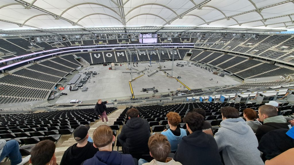 Der Rundgang begann mit einer Besichtigung der Haupttribüne, von wo aus wir einen tollen Blick auf das Spielfeld und die riesigen Tribünen hatten. Die Schülerinnen und Schüler waren beeindruckt von der Größe des Stadions und konnten sich gut vorstellen, wie hier bei Spielen eine unglaubliche Stimmung herrscht. Besonders spannend war der Blick hinter die Kulissen: Wir durften leider nicht die Spielerkabinen sehen, dafür den Pressebereich und sogar den Spielertunnel besichtigen, durch den die Mannschaften vor jedem Spiel aufs Feld laufen.